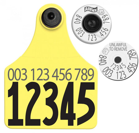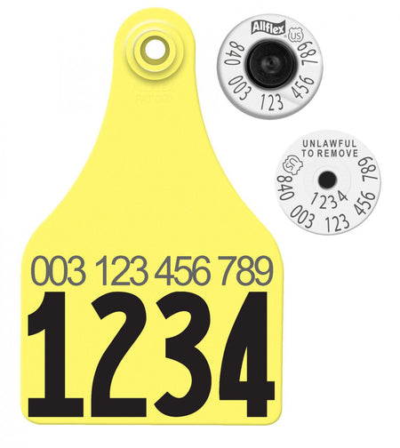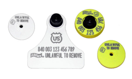 • All in One livestock tags are a combination of an EID button tag and a visual tag. These are ideal if you need the benefits of an EID tag and a visual tag, but want the set to only take a spot in one ear. These are also good options in situations of high volume tagging, as you are simply attaching a single tag instead of 2 separate tags.